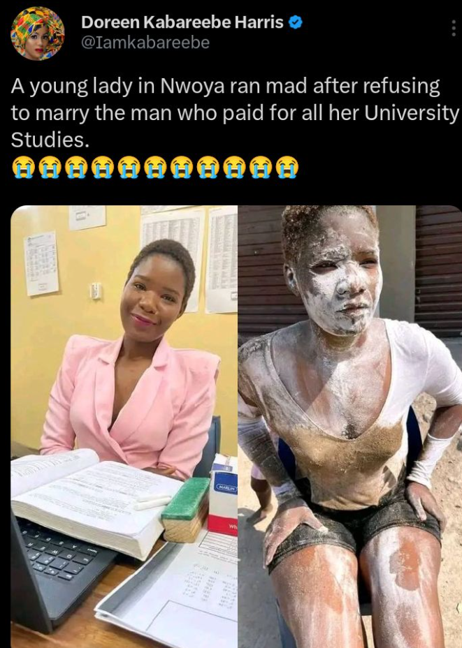 A shocking and unconfirmed incident has been reported in Nwoya involving a young lady who allegedly suffered a mental breakdown after refusing to marry the man who had fully financed her university education.